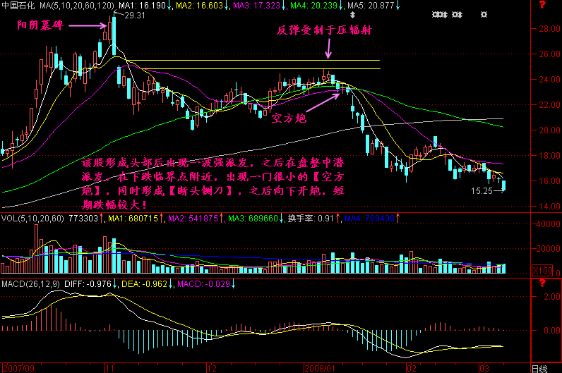 图268-5 小结:空方炮是由两阴夹一阳构成的,第一天空方发力,股价下跌,第二天多头反扑,股价反弹,第三天空方再发力,股价吞没阳线,从而在K线上形成两阴夹一阳【空方炮】! 空方炮是空头得势的表现,一般出现在股价大幅上涨之后的高位,此时往往会伴随出现一些其它头部特征,比如【三死叉见顶】、【阳阴墓碑】、【断头铡刀】、【月价压】、【月量压】等等……,这个时候出现的空方炮才是空方炮!